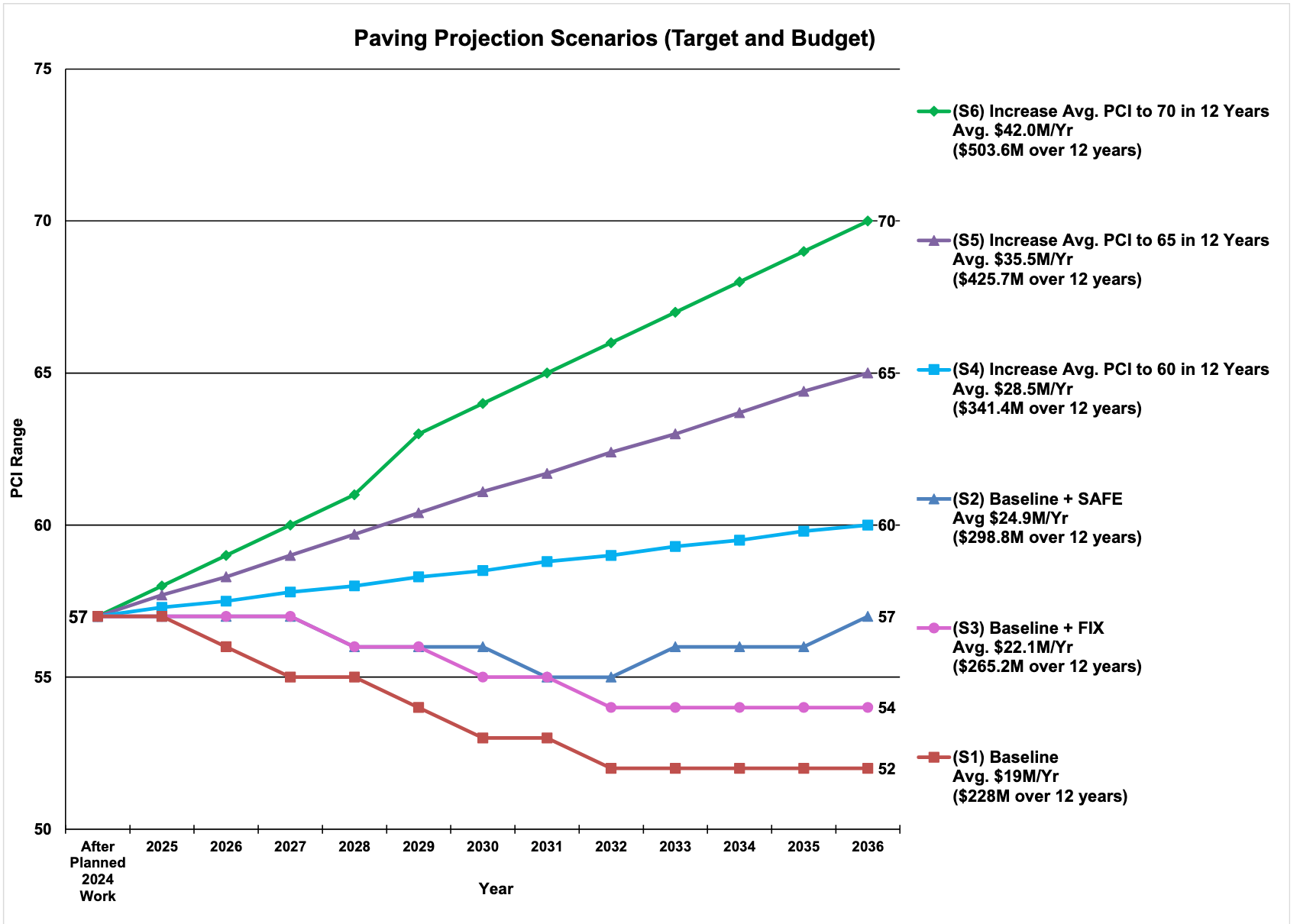 Both measures however were dunked on by the bombshell city report that neither FF or EE would raise enough money to reach the city target rating of 70 out of 100 for roadway pavement conditions, due to the dramatic inflation of construction costs. However, the non-partisan report also found that Measure FF’s budget would maintain the city’s pavement quality score from 57 in the next decade, while Measure EE would decrease our score from 57 to 54. (It’s the image at the top).