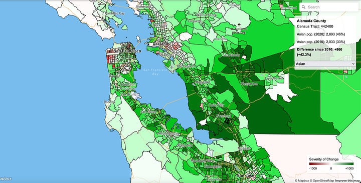 It’s hard to distinguish how much of this white population decline is preference vs. affordability (it’s probably both), but you can see in these 10-year census maps how the only areas becoming whiter in the Bay, are formerly redlined, Black and Hispanic neighborhoods in the urban core. When my girlfriend’s family moved to Fremont in 2000, her neighborhood was equally white and Asian. Now, the white population barely exceeds 10% while Indian and Chinese families now represent the majority.
