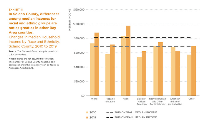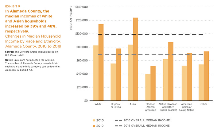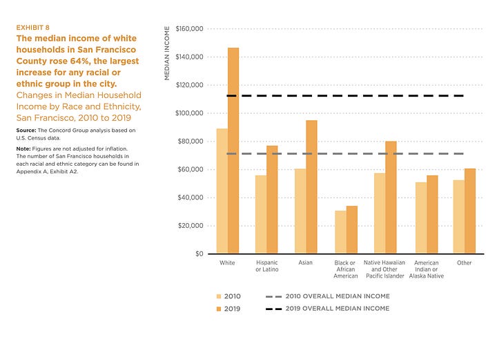 SPUR crunched Census data on the financial situations of Bay Area ethnic groups and the image reveals Black residents are being left behind region-wide, with particular acuteness in San Francisco. In the epicenter of Silicon Valley, Black income growth lagged behind White and Asian households. In the East Bay and Solano County, Black households saw a raise of just $10,000 over 10 years. But San Francisco was the worst of all: the Black community’s income barely budged since 2010. Black San Franciscans live in the shadow of a technology and wealthy renaissance that have exploded the incomes of their white neighbors.